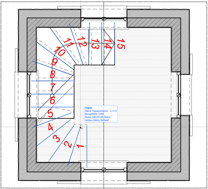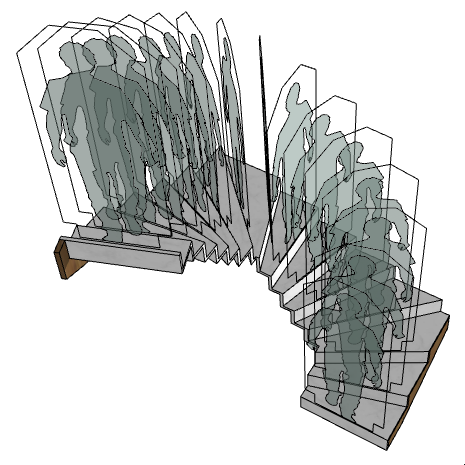 Das Objekt erzeugt im 3D für jede Stufe das z.B. nach DIN18065 notwendige lichte Raumprofil als Drahtrahmen. Entweder rechteckig oder mit abgeschrägten oberen Ecken für Sonderfälle. Optional unten mit Aussparungen an den Seiten für Sockel/Wangen.