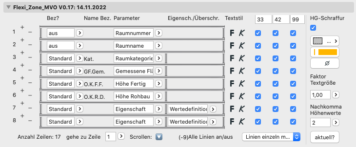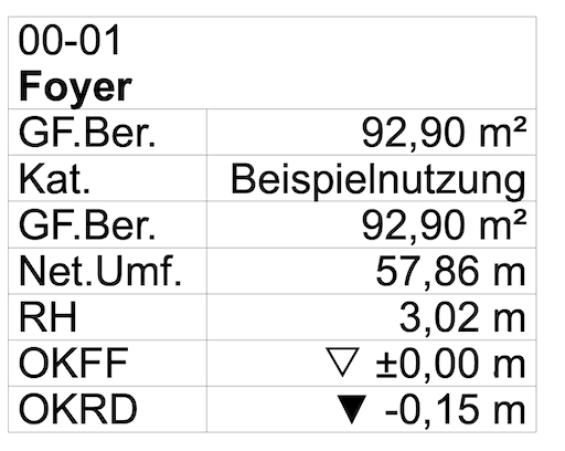 mehrere Raumkategorien, auf die man die platzierten Raumstempel mappen kann, d.h. je Raumkategorie ist eine unterschiedliche Anzahl an dargestellten Parametern möglich.