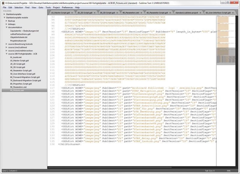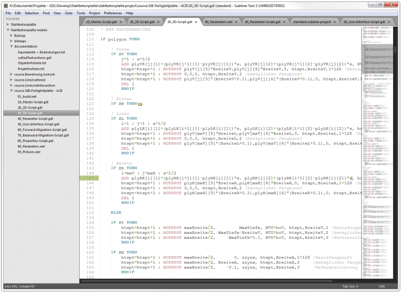 Der in ArchiCAD eingebaute Skripteditor entspricht nicht mehr dem heutigen Stand einer Quellcodeentwicklung. Da Graphisoft selbst mit einem eigenen Entwicklungssystem die Objektentwicklung betreibt, ist hier auch in Zukunft nur mit wenig Verbesserungen zu rechnen. Auf der anderen Seite gibt es verschiedene mehr oder weniger mächtige Quellcode-Editoren, die essentielle Funktionen wie Spaltenmarkierung, Code folding, Syntax Highlighting, Snippets und Vorlagen e.a. beherrschen. Einer der ausgereiftesten Editoren ist sicher Sublime Text. Dieser liegt als Shareware für MacOS und Windows vor. Leider sieht ArchiCAD es nicht vor externe Editoren in die Entwicklungsumgebung (IDE) einzubinden.