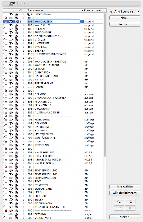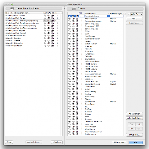 Schauen wir uns die Standard-ArchiCAD-Ebenen an, so sind diese relativ strukturlos (Bild 1 rechts):