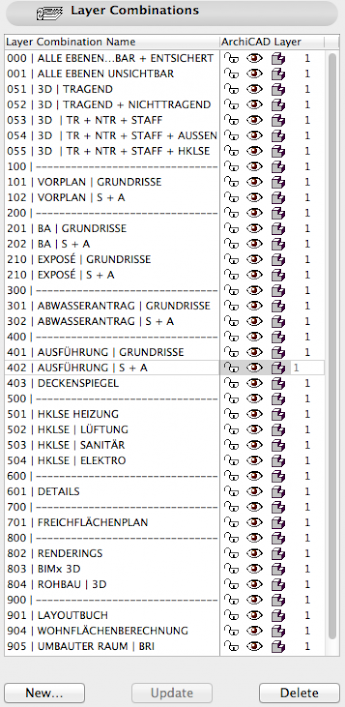 Das hier an Hand der Ebenenstruktur erläuterte numerische Ordnungssystem verwende ich auch in anderen Bereichen meiner ArchiCAD-Projektvorlagedatei in ähnlicher Art, wobei z.B. die 100er Zahlen immer die tragenden Strukturen, das Mauerwerk oder den Beton kennzeichnen.