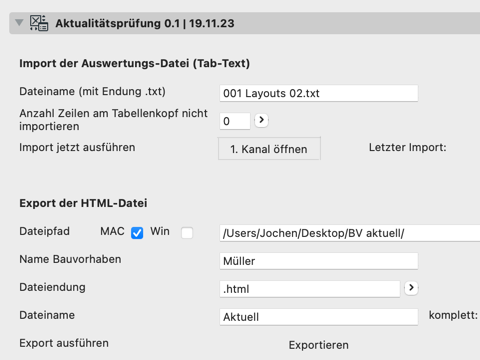 - Man speichert eine Auswertung der Projektinhalte (Download des Schemas siehe unten) mit allen zu prüfenden Layouts als Tab-Textdatei ab, an einem Speicherort, welcher sich innerhalb der geladenen Bibliothek befindet.