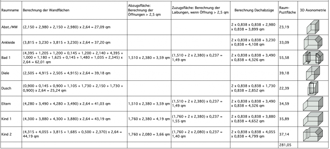 Mit Hilfe einer interaktiven Auswertung, welche die Berechnungsformeln und die Berechnungsergebnisse darstellt, werden die Putzflächen raumweise dargestellt und die Gesamtputzfläche ermittelt.
