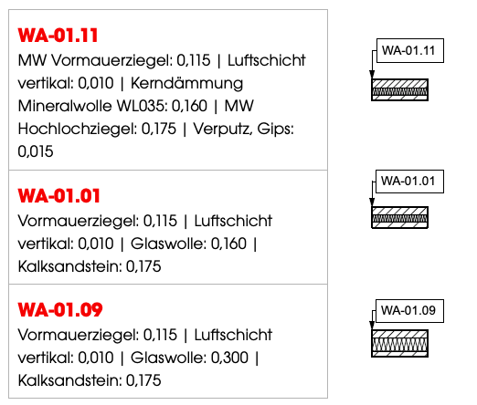 Die Datenhinterlegung würde z.B. in den Namen (incl. Baustoffe und Schichtstärken, was redundante Informationen sind) von Attributen erfolgen und mittels Eigenschaftenmanager ausgewertet werden.